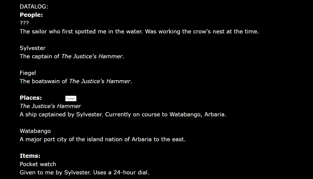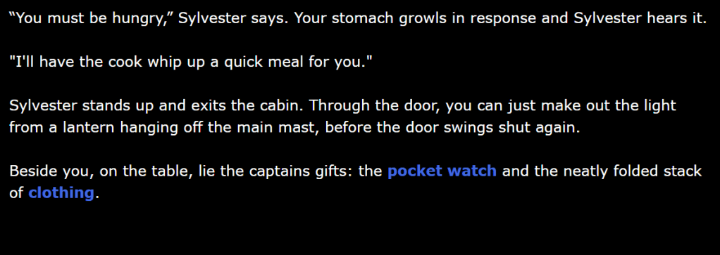 Rescued at sea, but without your memories, explore a small ship and have conversations with sailors. Discover the secret purpose of their voyage. This is a clockwork game where you can replay the same day multiple times (like in the movie Groundhog Day). Each of the ten sailors has their own schedule.