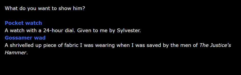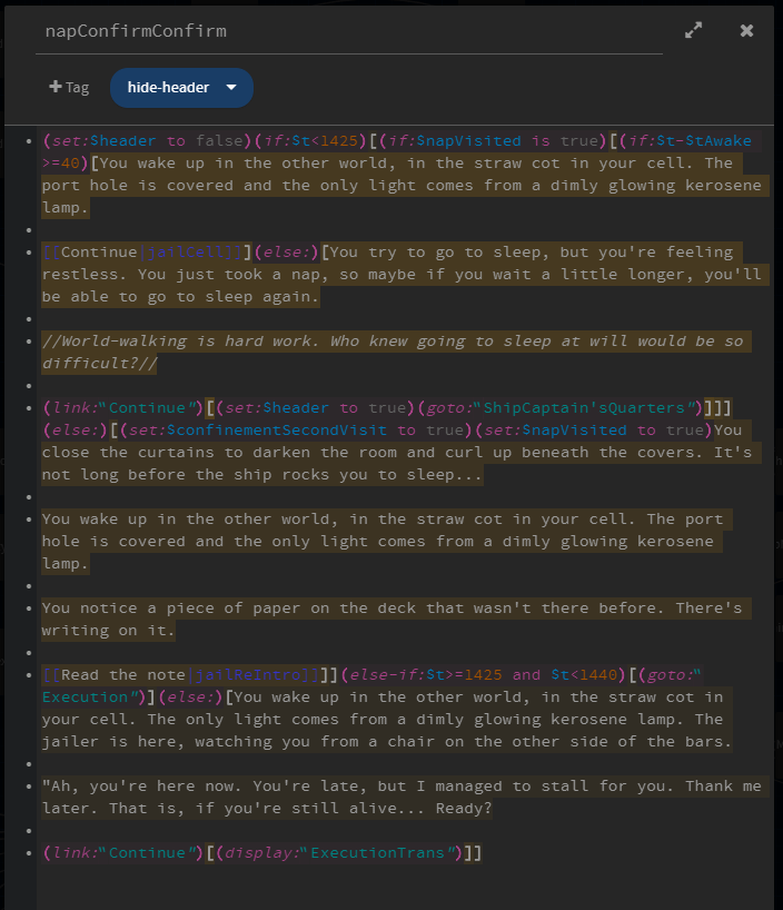 Screenshots below show some of the game’s passages in one of Twine’s scripting languages, Harlowe.