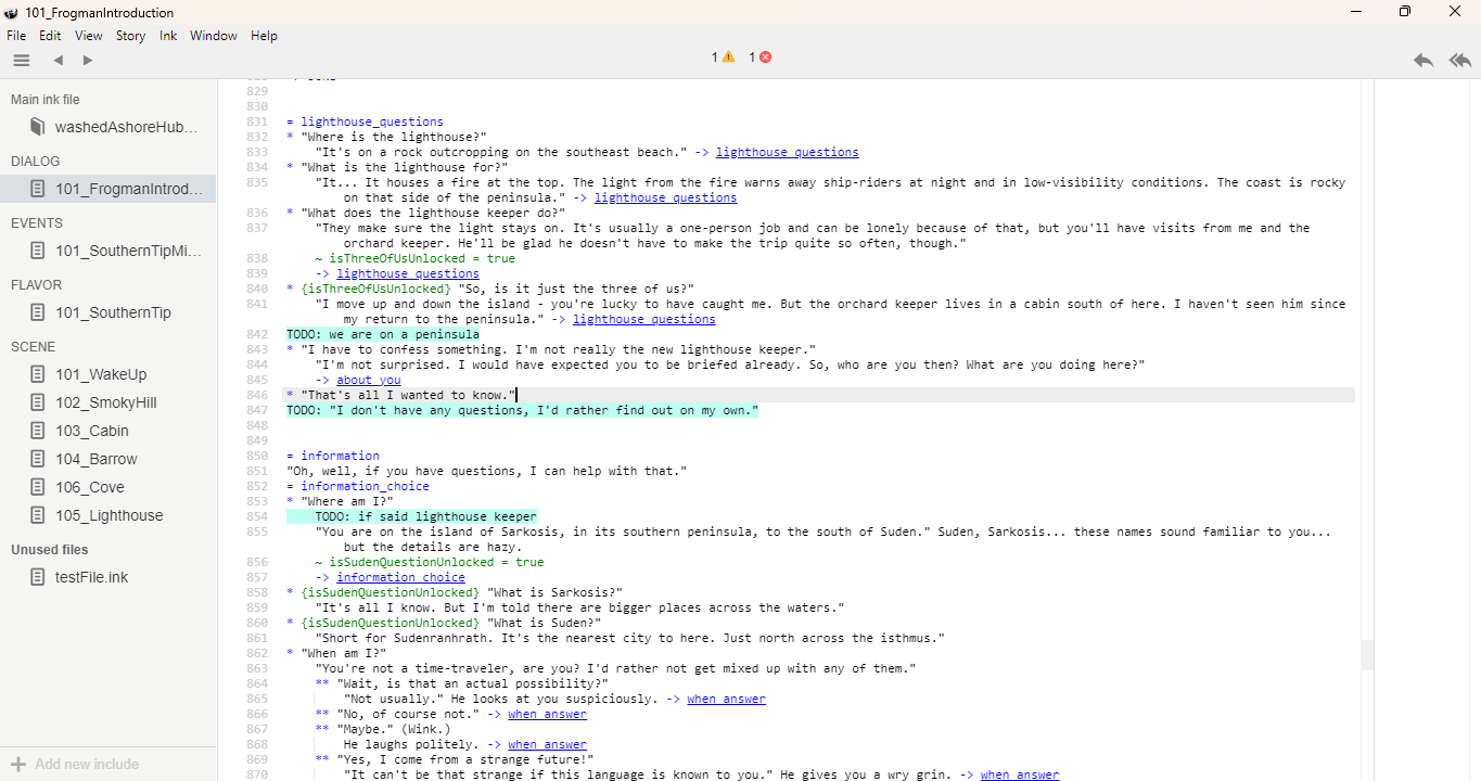 To finish the Spring 2023 semester, I spent some time proving the dialog system by writing some dialog for a major NPC the player will encounter in the game. I use a text editor called Ink that allows me to write branching dialog responses. While it proved challenging at times to integrate Ink with Unity and display text without major errors, after a few weeks of work, I was able to create the result I was looking for.
