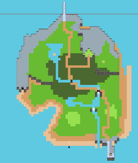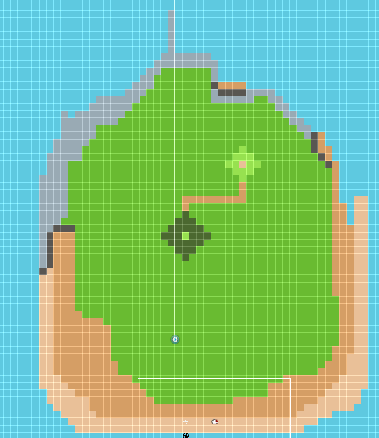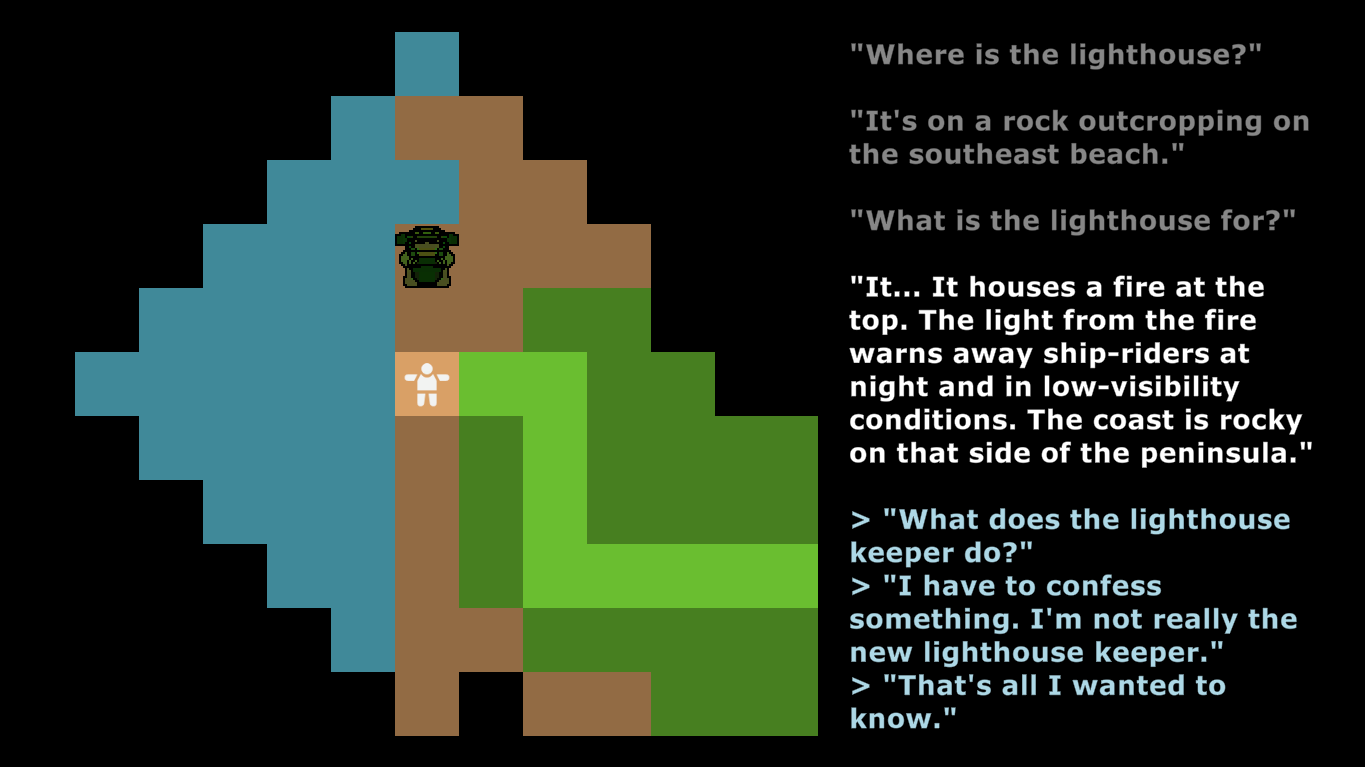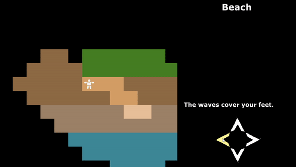 Another important beginning stage of the development process was ensuring that the map itself was interesting to explore. The map went through one major redesign, with additional tuning required to clarify the terrain and improve the feeling of exploration. I added higher-fidelity sprite art, additional points of interest, and adjusted the frequency of the small lines of text that display as you explore.