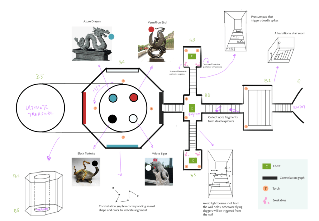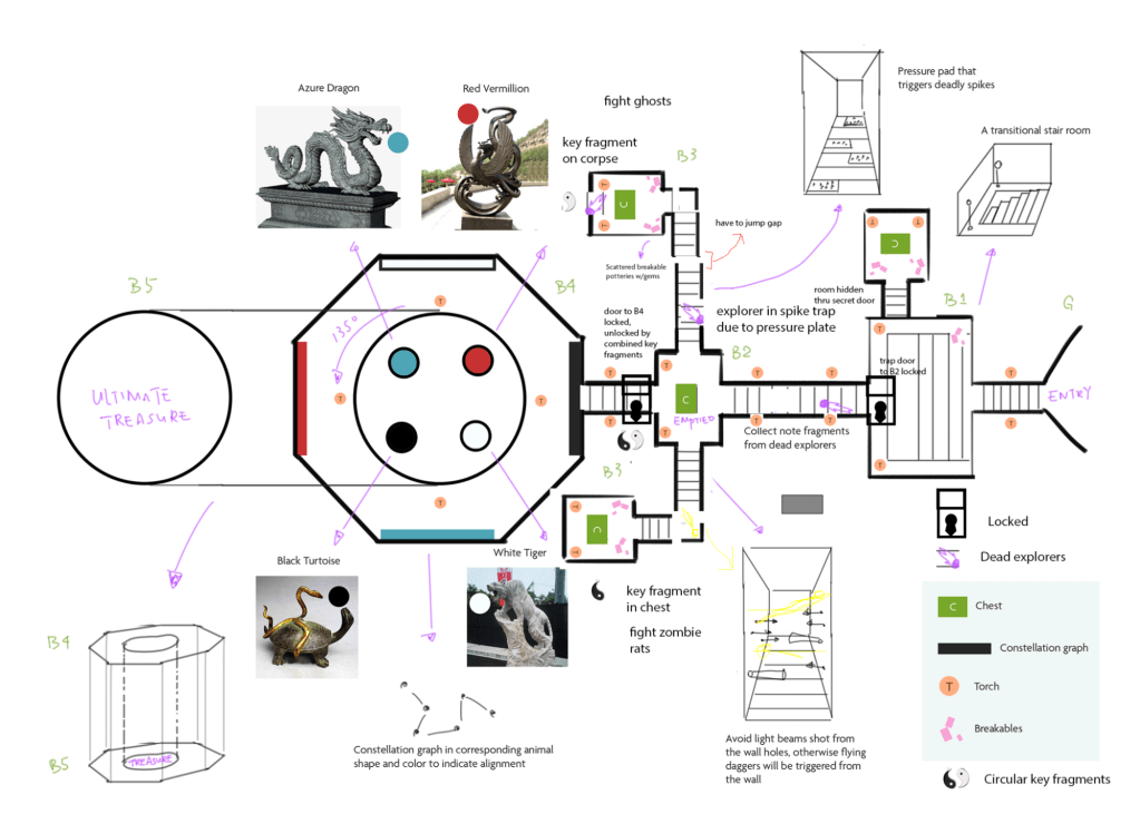 One of my first design tasks was to do a mental playthrough of my lead designer’s level design for the entire tomb exploration game. Below is their original map, followed by my edits and playthrough notes providing suggestions for improved gameplay.