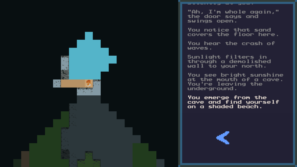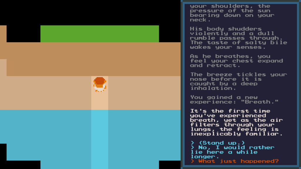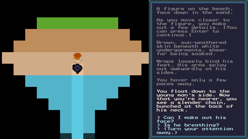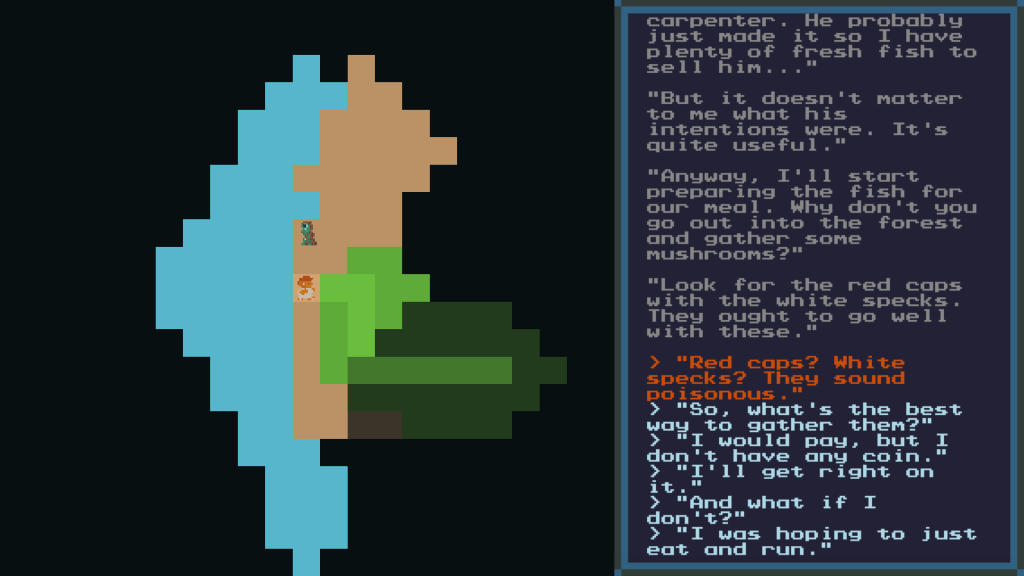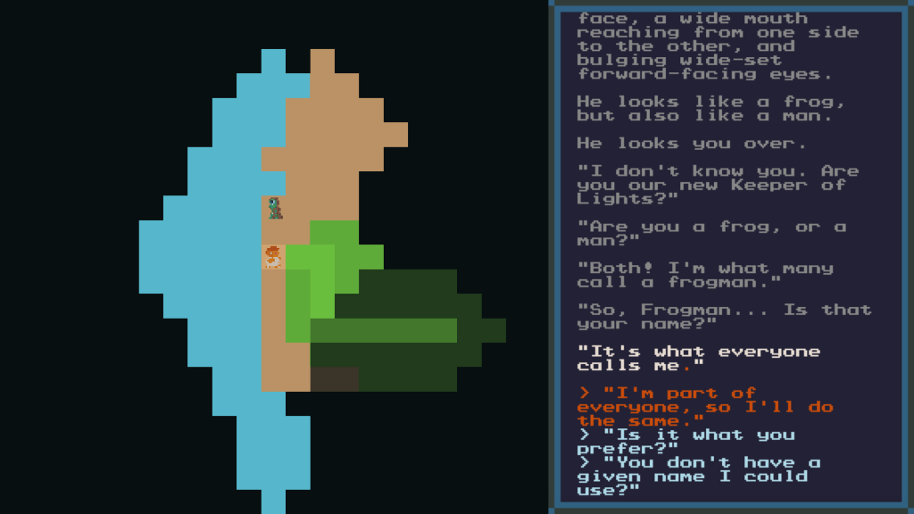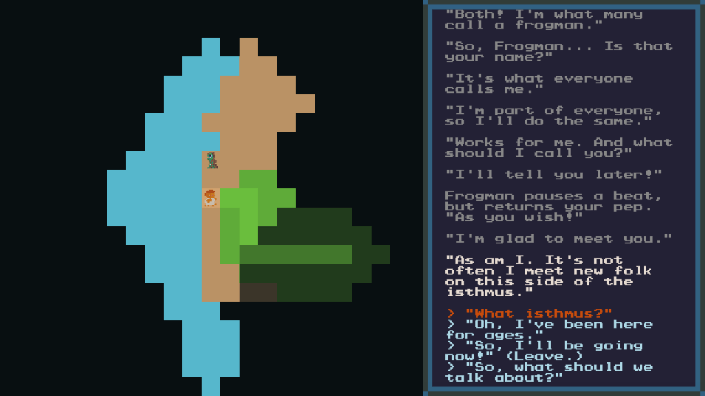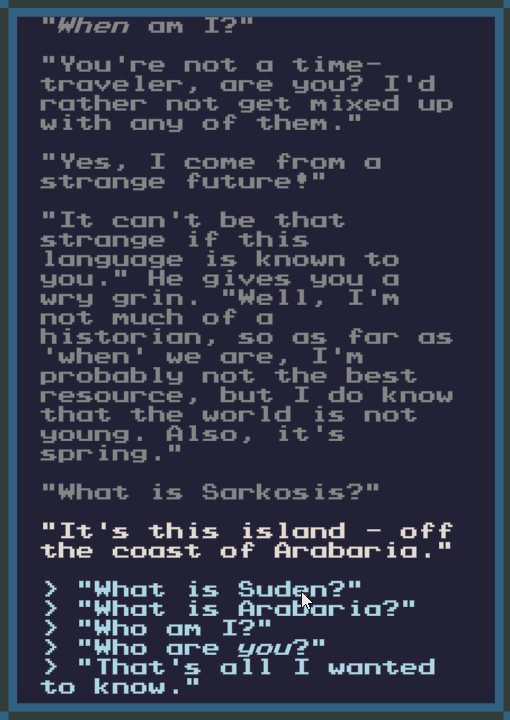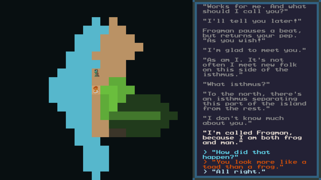 Washed Ashore contains one extensive conversation with a non-playable character as well as a few other shorter conversations. The dialog branches based on the player’s choice. My philosophy in interactive fiction is to allow the player to express themselves at all times. This is achieved usually by giving the player an option to accept, reject, deflect, or ignore any situation at any time (a model adapted from Jon Ingold’s “Sparkling Dialog” talk).