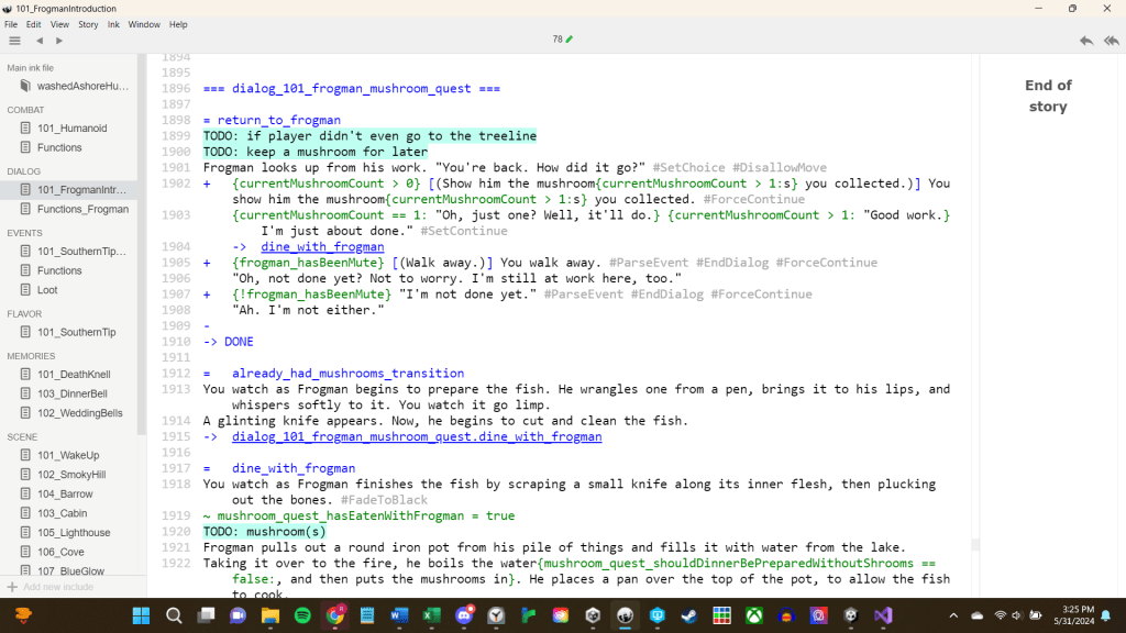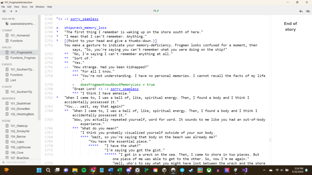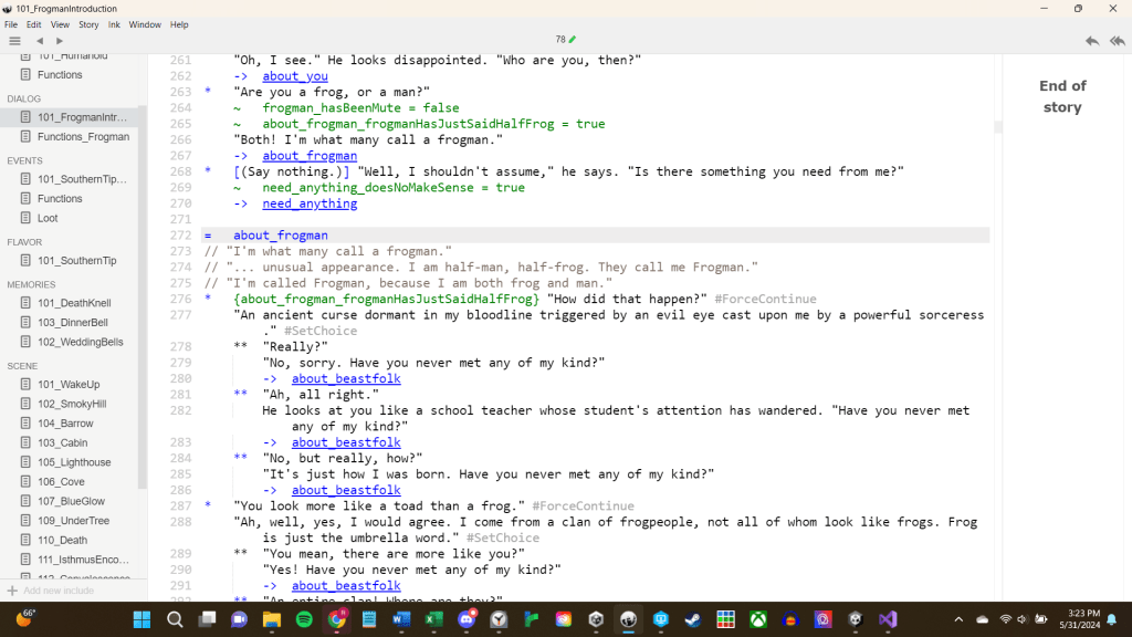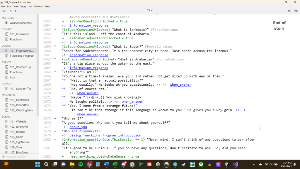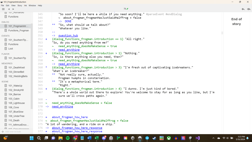 Although the story or dialog doesn’t branch away from the main drift every single time the player selects a new option, the illusion of a real conversation is maintained because the player is given the means to express themselves in every situation, with the possibility of a more extensive alternate path always possible. Below is a peek behind the curtain at one of my scripts, which uses Ink, a narrative scripting editor. I use Ink in tandem with Unity to implement most text in the game.